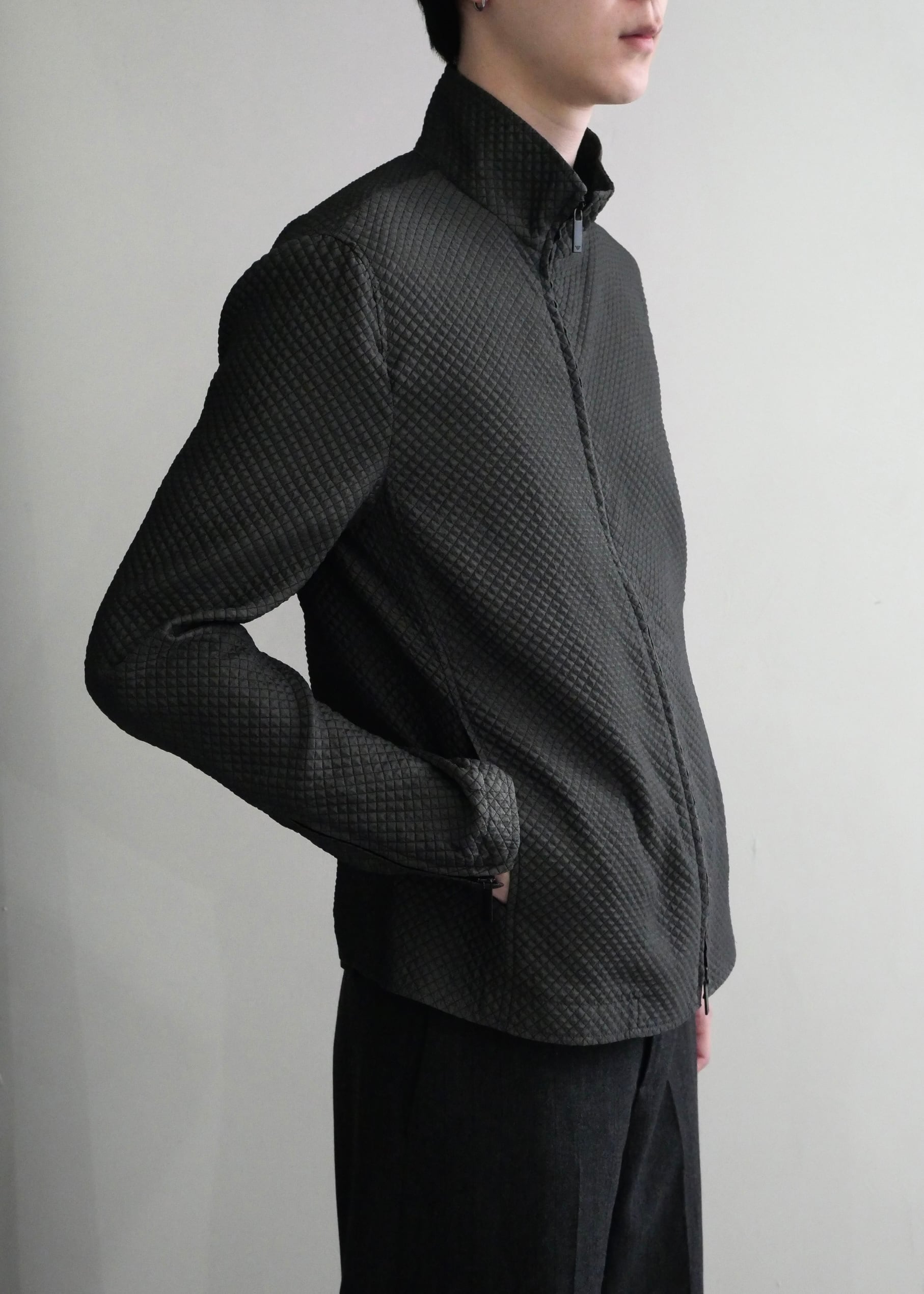 フロントジップとポケットジップが斜めに配置されており、直線的になりがちなデザインに動きを与え、着用時に自然な立体感を生み出します。また、フロントはダブルジップ仕様となっており、上下から開閉が可能。シルエットの調整やレイヤードスタイルなど、着こなしに変化を加えられる実用性も兼ね備えています。